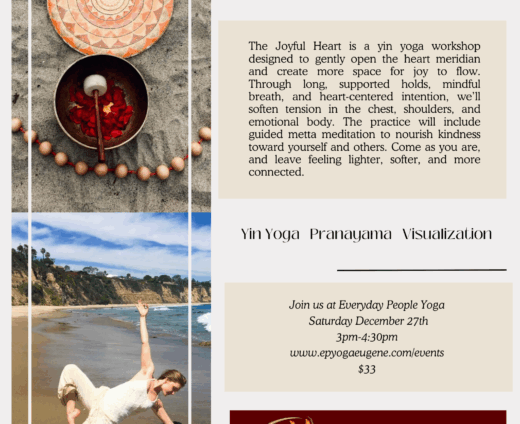 The Joyful Heart is a yin yoga workshop designed to gently open the heart meridian and create more space for joy to flow. Through long, supported holds, mindful breath, and heart-centered intention, we’ll soften tension in the chest, shoulders, and emotional body. The practice will include guided metta meditation to nourish kindness toward yourself and others. Come as you are, and leave feeling lighter, softer, and more connected.