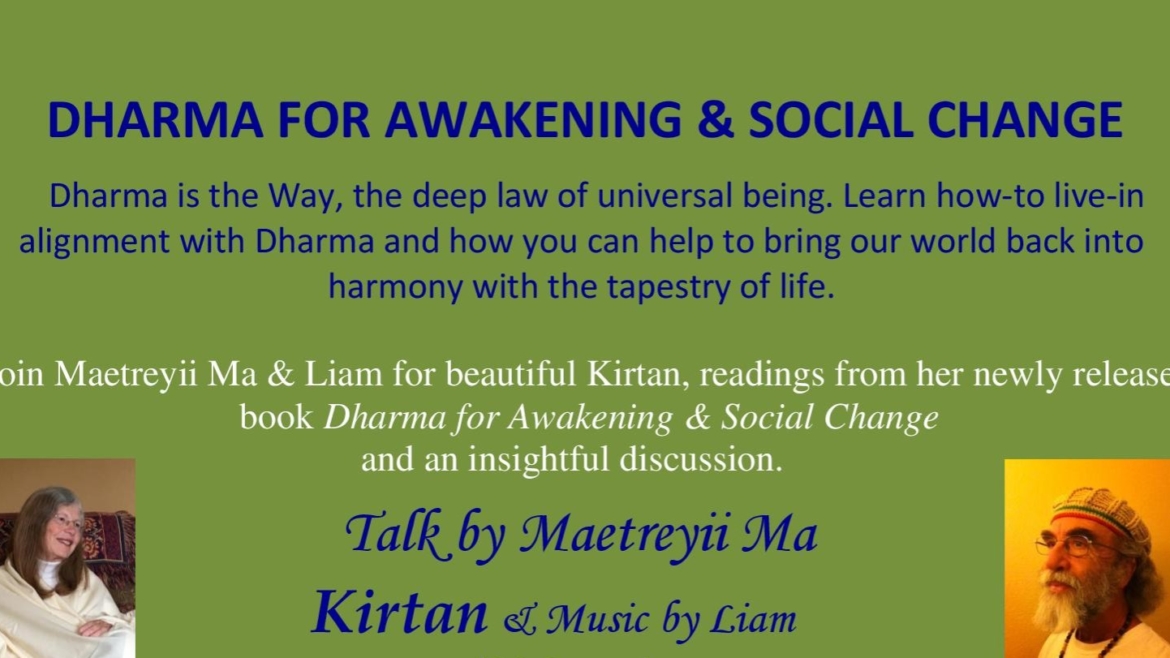 Join Maetreyii Ma for a dharma talk, kirtan and reading from newly released book: Dharma, the Way to Awakening and Social Change.