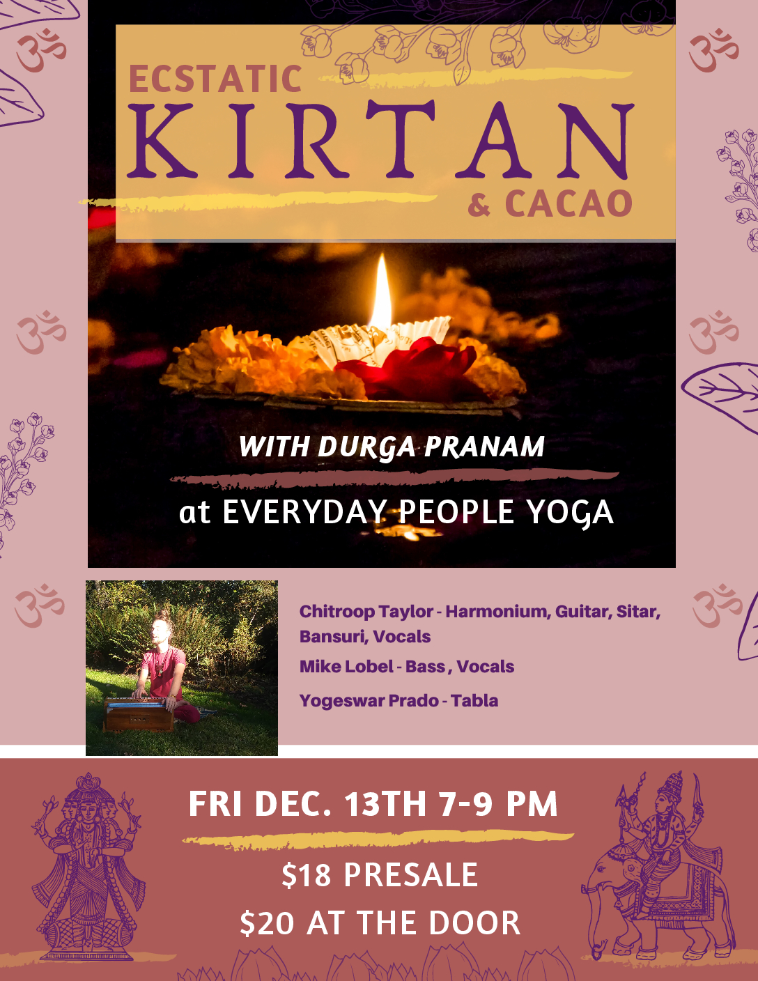 Everyday People Yoga hosts Chitroop Taylor in the debut of the ecstatic Kirtan band, Durga Pranam! Heart soaring, soul stirring, body shakin Devotion! Durga Pranam features Yogeshwar Prado on Tabla…