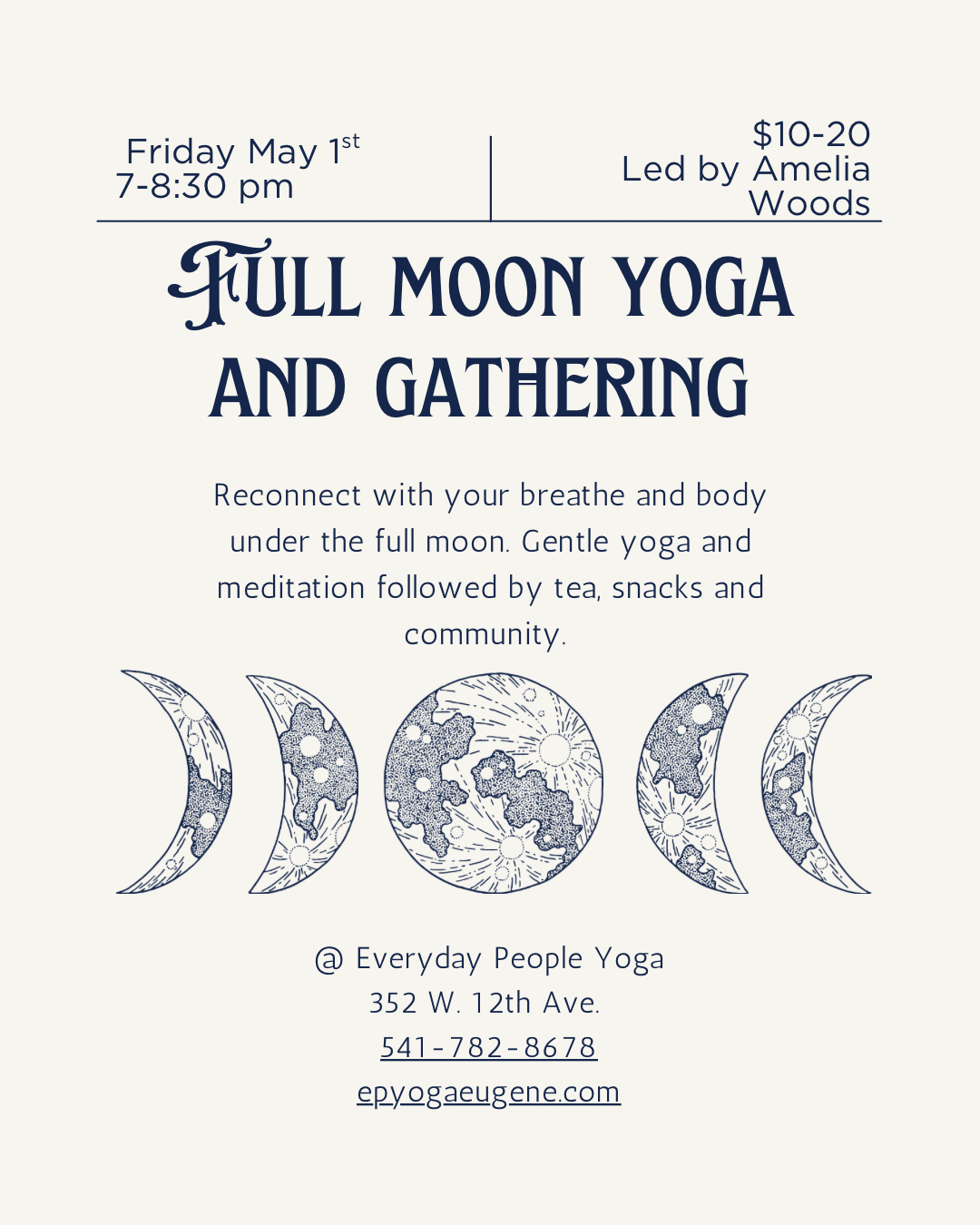 Full Moon Gentle Flow & Gathering . Led by Amelia Woods 7-8:30p Friday, May 1st $10-$20 sliding scale . Let’s gather together under the full moon to breathe, connect with…