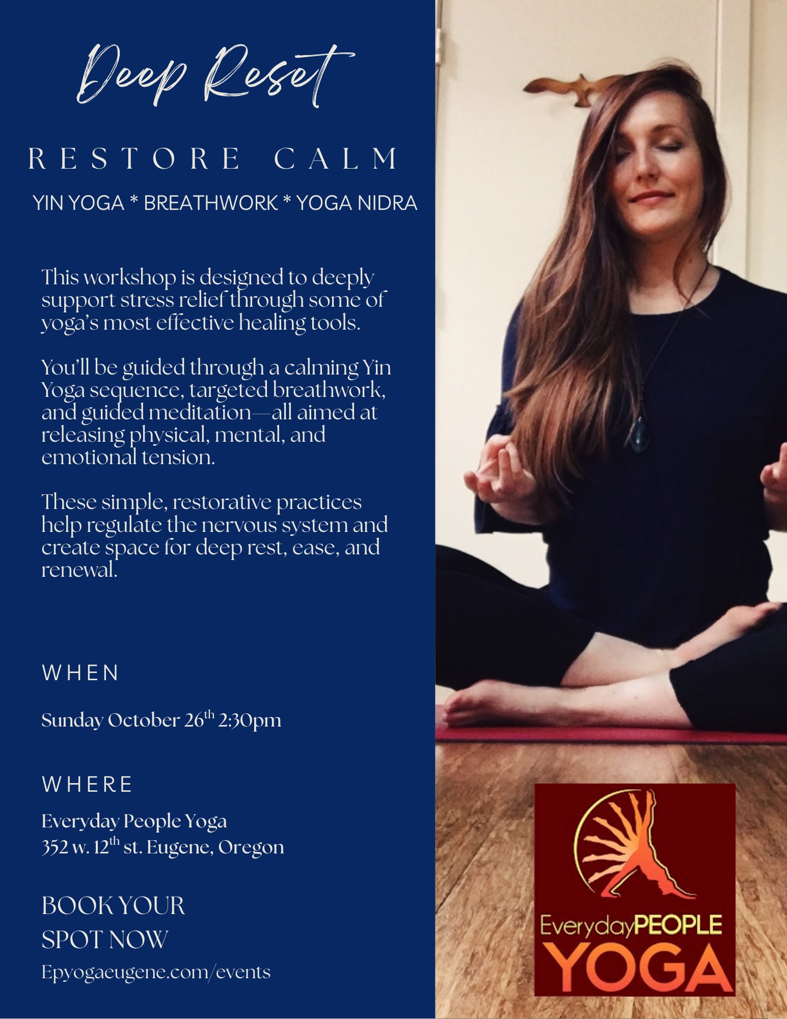 Deep Reset : Yogic tools for creating calm 2:30-4pm Sunday, October 26th $25 early-bird through Friday, October 25th $30 day of event   This workshop is designed to deeply support stress…