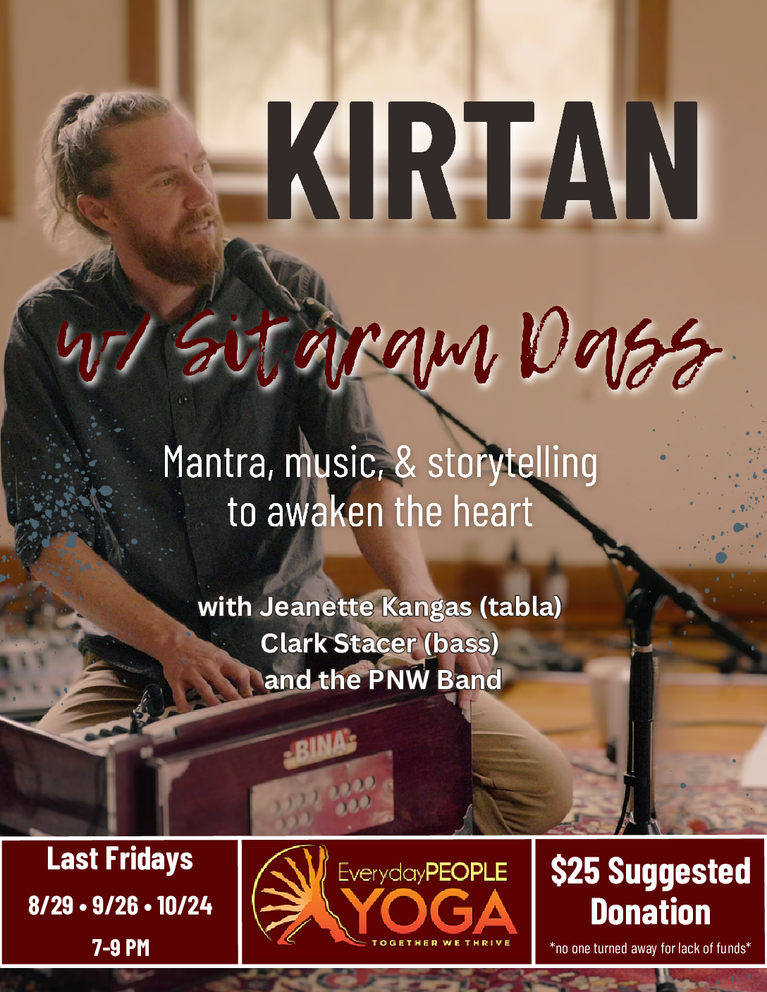 Last Friday Kirtan with Sitaram Dass 7-9pm Friday, October 24th $25 Come together in community through chanting, teachings, Q&A, and storytelling. These monthly kirtans intend to awaken the Heart of Love. Led by Sitaram Dass…