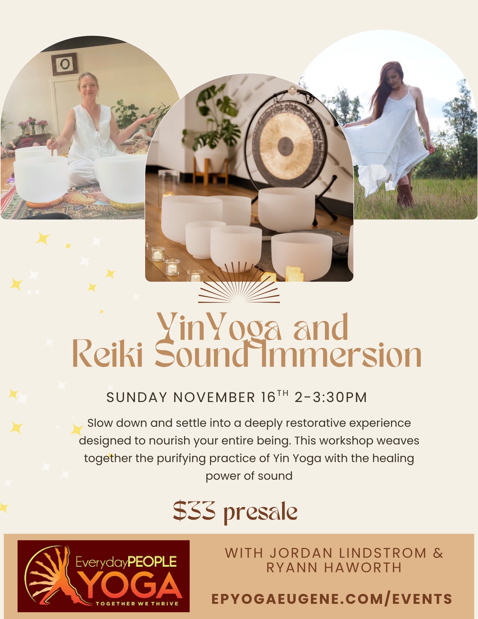 Yin Yoga and Reiki Sound Immersion With Jordan Lindstrom & Ryann Haworth 2:00-3:30p Sunday, November 16th $33 early-bird through Saturday, November 15th $40 day of event Slow down and  settle…