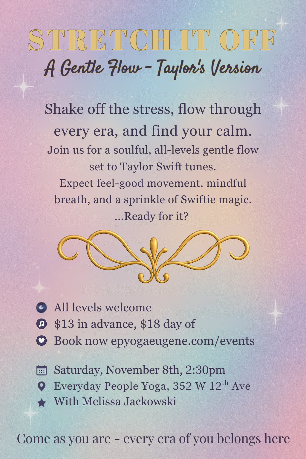 Stretch it Off With Melissa Jackowski 2:30-3:30p Saturday, November 8th $13 early-bird through Friday, November 7th $18 day of event An all-levels gentle flow to shake off tension, open your…