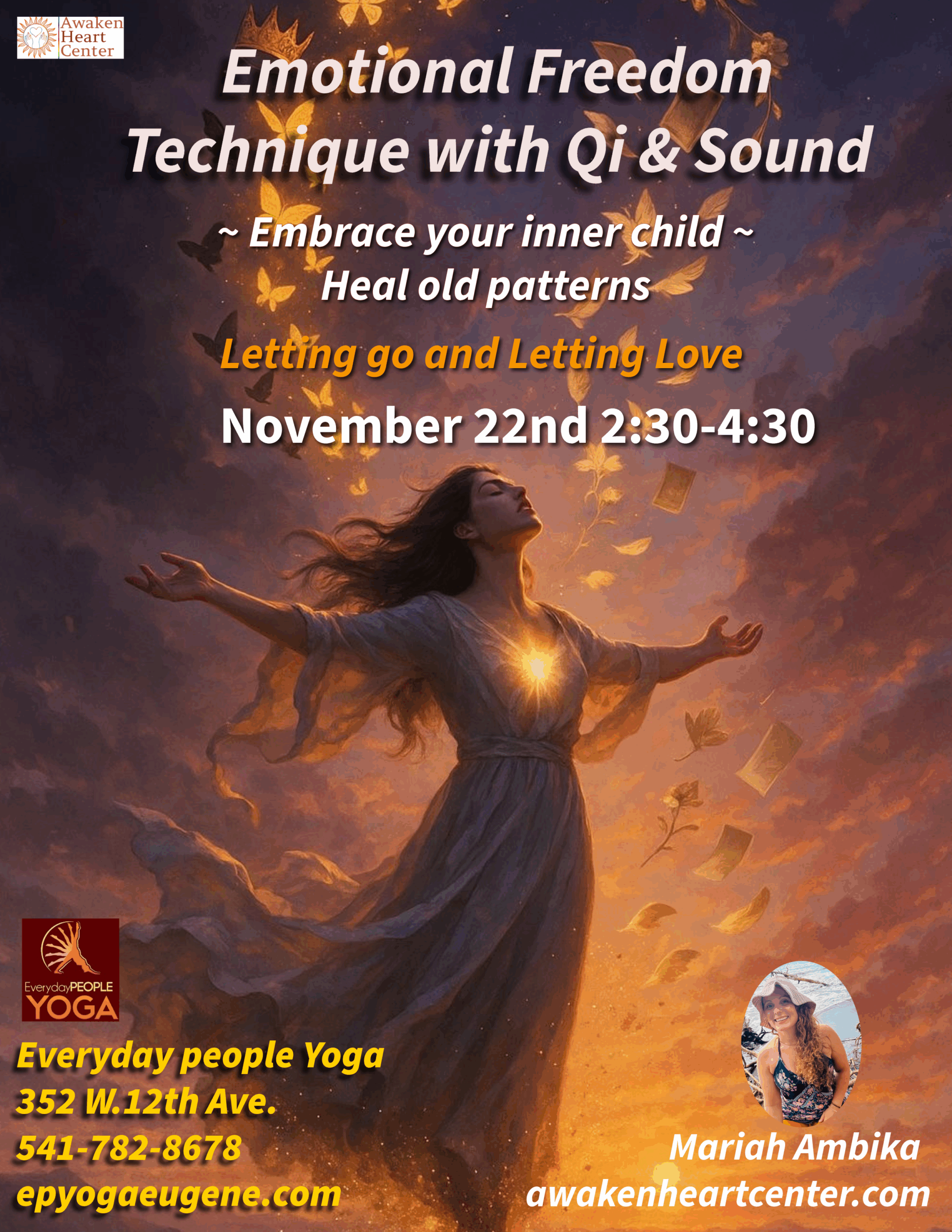 Letting go: EFT with Qi flow & Sound healing With Mariah Ambika 2:30-4:30p Saturday, November 22nd $25, early bird pricing through Friday, November 21st $28 day of event Often we…