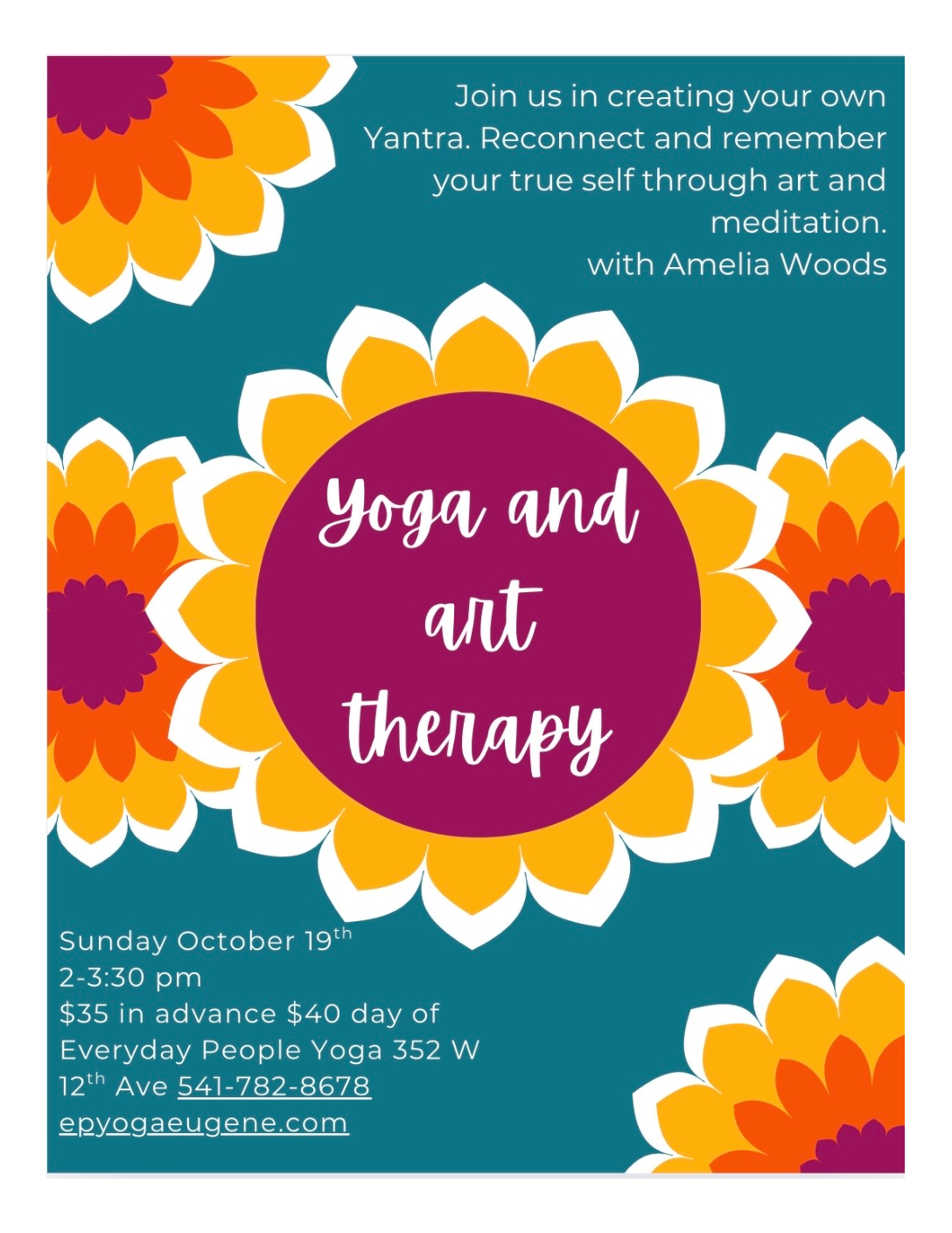 Yoga and Art Therapy Led by Amelia Woods 2:00-3:30p Sunday, October 19th $35 early-bird through Friday, October 18th $40 day of event Create your own Yantra. Reconnect with your true…