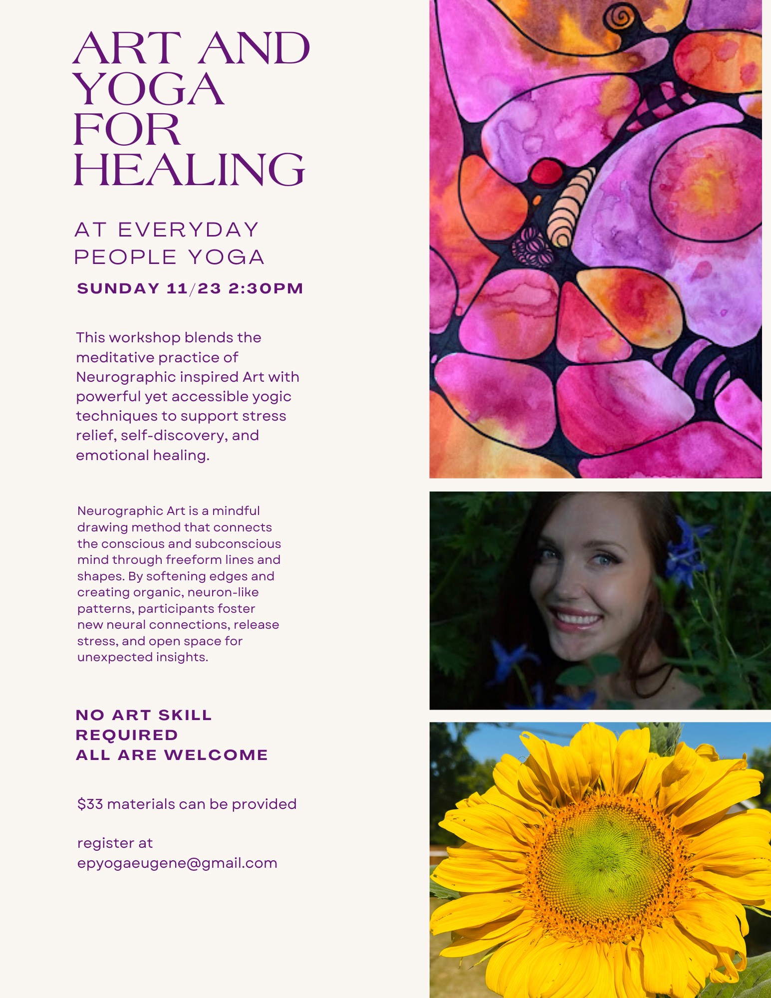 Art & Yoga for Healing  With Jordan Lindstrom 2:00-3:45p Sunday, November 23rd $33 This workshop blends the meditative practice of Neurographic inspired Art with powerful yet accessible yogic techniques to…